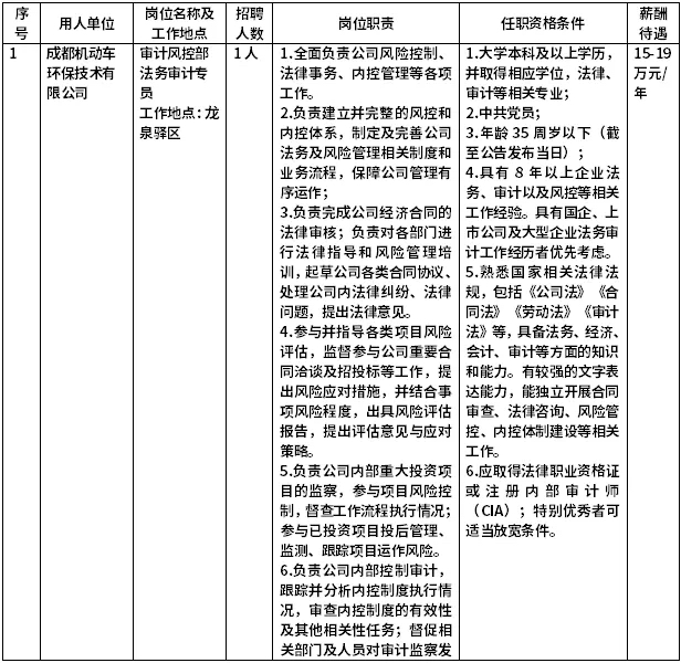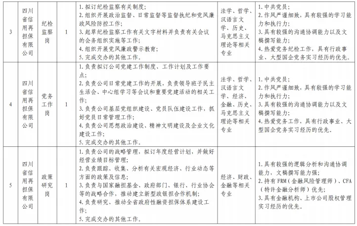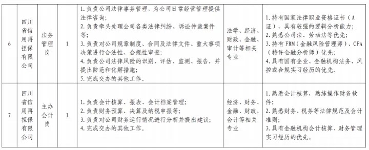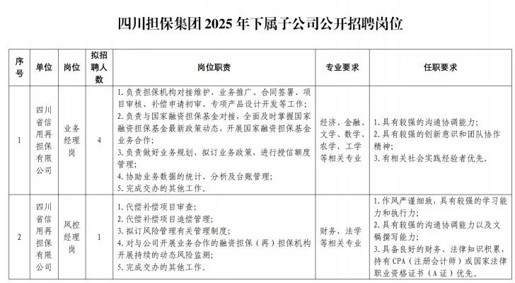 本次招聘为四川担保集团下属子公司四川省信用再担保有限公司,包括业务经理岗、风控经理岗、纪检监察岗、党务工作岗、政策研究岗、法务管理岗、主办会计岗等7个岗位,共计10人。