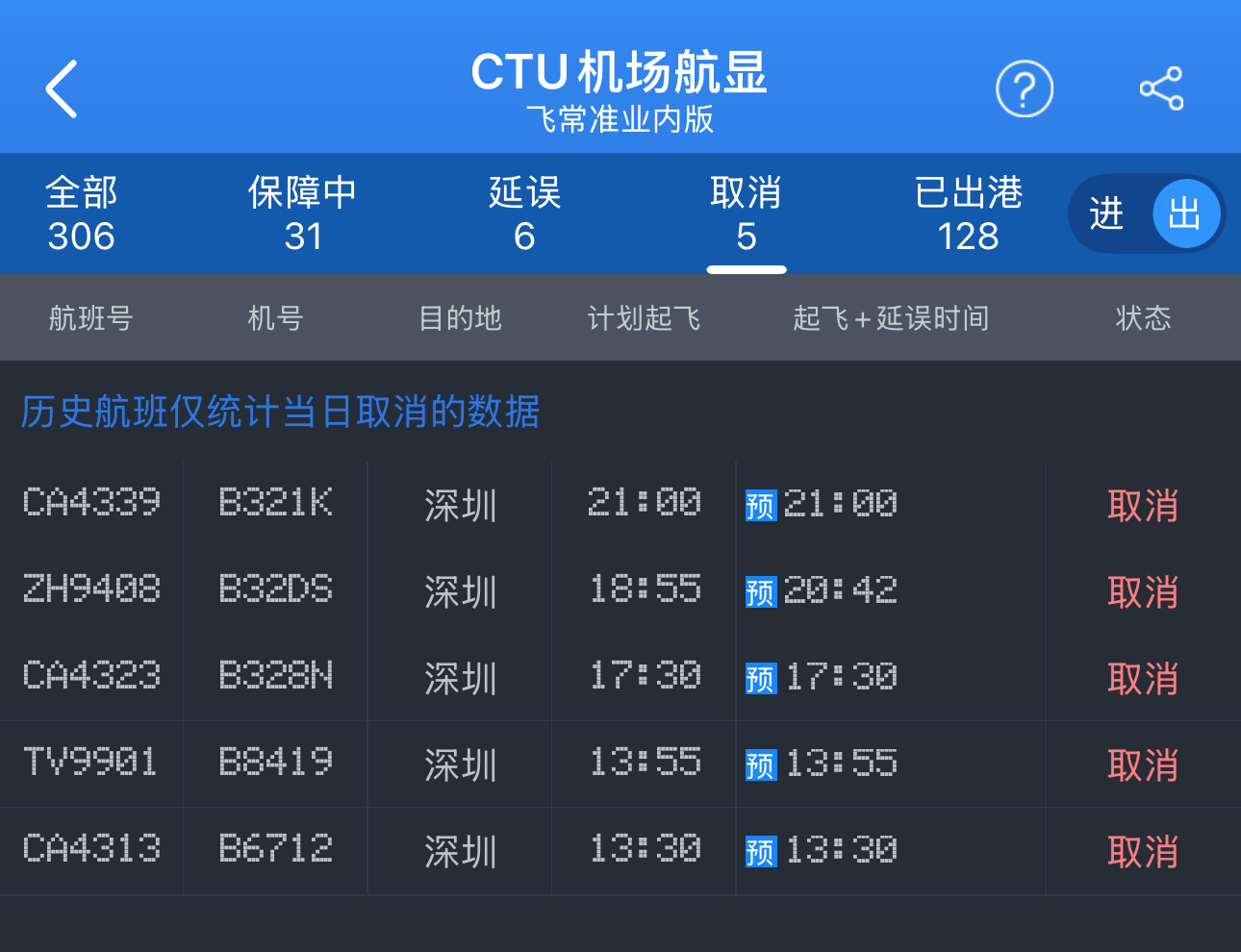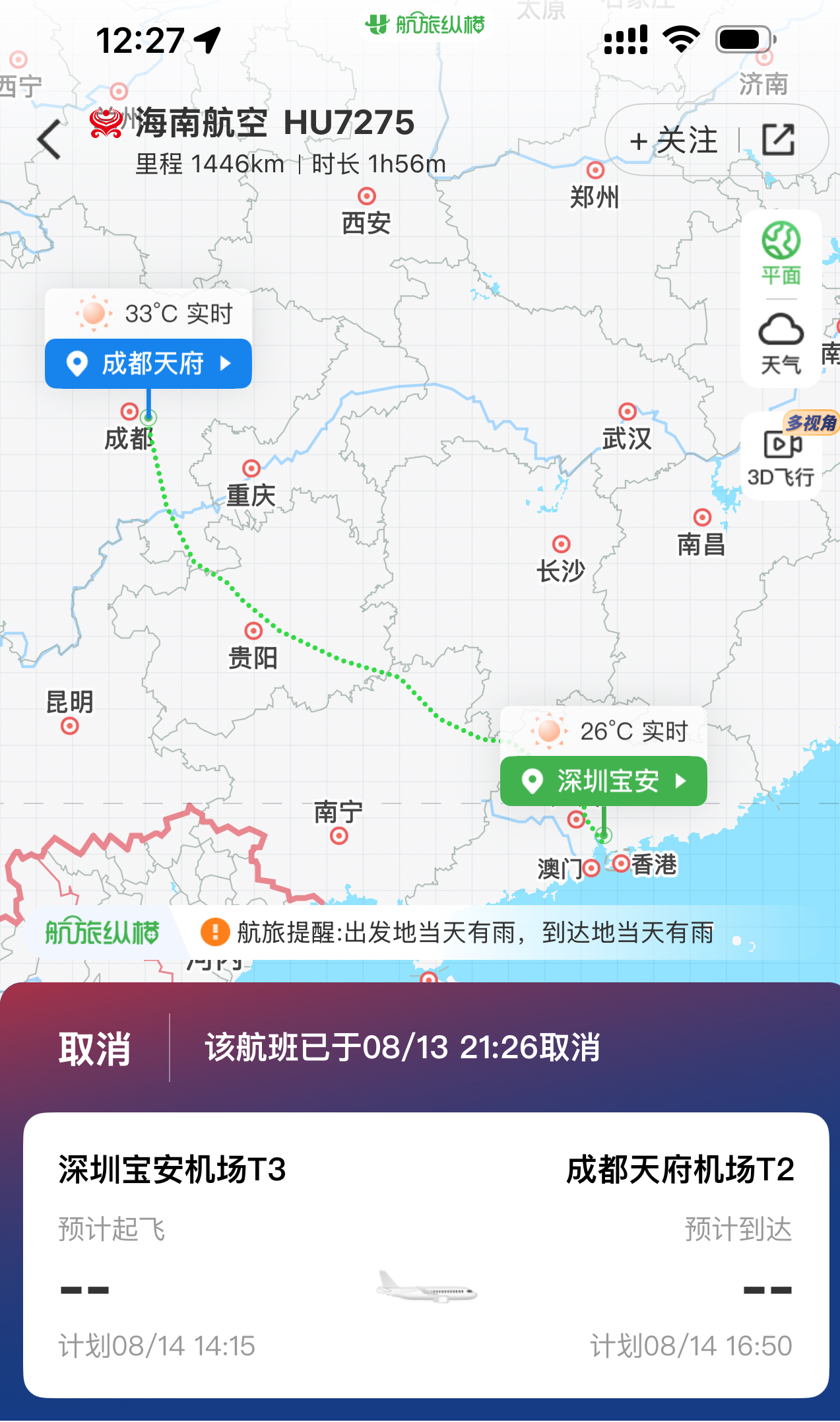 8月14日,记者通过飞常准、航旅纵横两个平台查询,发现成都两场飞广州、深圳等多个航班已取消,并有多个航班处于延误状态。截至8月14日13时,成都两场当日飞深圳宝安的这些航班已取消:CA3684、ZH4409、CA4313、TV7481、TV9901、GJ5159、EU7859、SC6159、KY6759、CA3977、ZH3943;成都两场当日飞广州白云的已取消航班有:TV9765、ZH3963、EU7967。