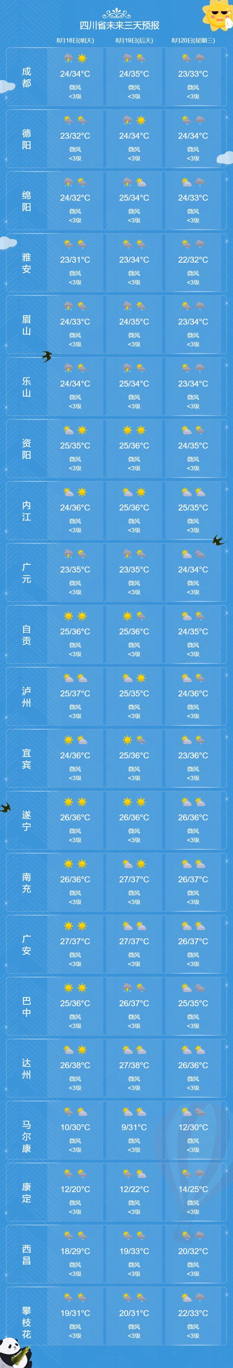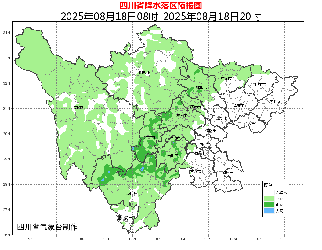 未来三天:盆地西部多阵雨或雷雨,部分地方有中到大雨,局部暴雨,盆地其余地方多云间晴;川西高原大部和攀西地区多雷雨或阵雨,局部地方有中雨,个别大雨。需防范局地强降雨可能引发的气象次生灾害风险及雷雨时伴有的短时阵性大风造成的不利影响。