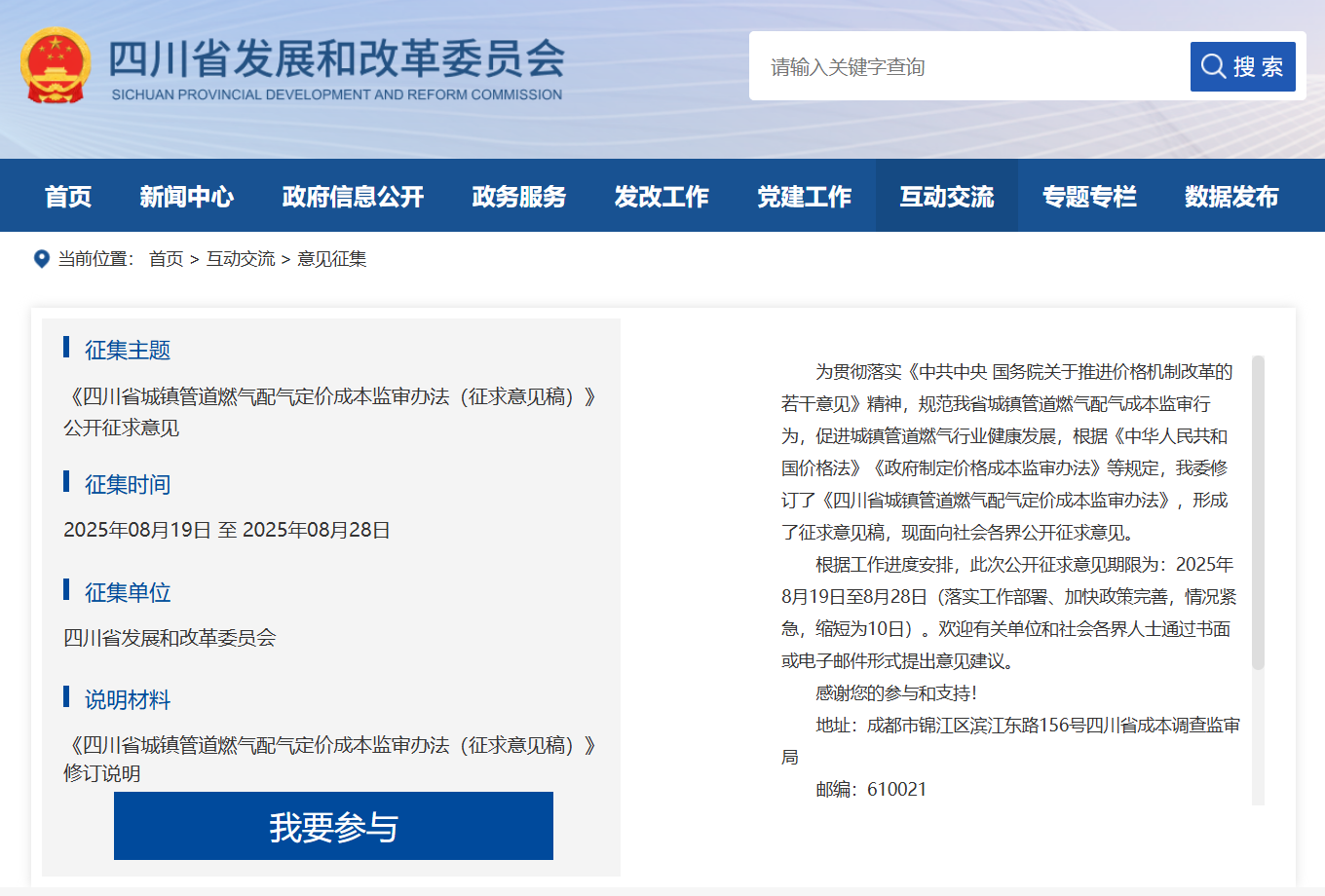 四川发布客户端消息 8月18日,四川省发展和改革委员会面向社会各界公开征求新修订的《四川省城镇管道燃气配气定价成本监审办法(征求意见稿)》意见。
