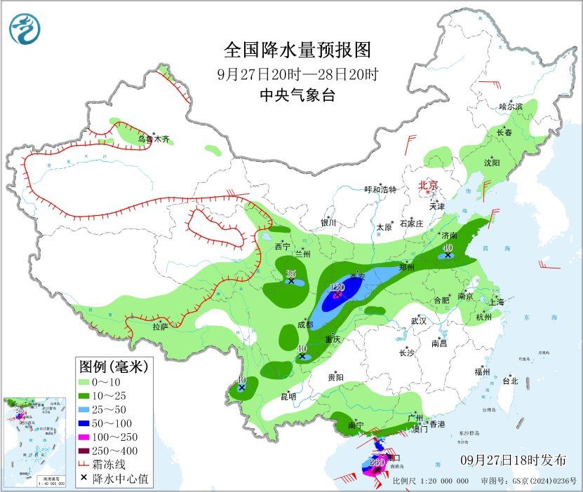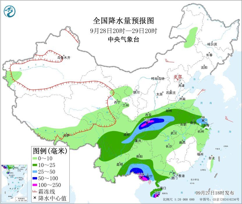 预计,9月28日08时至29日08时,四川东部和南部、陕西南部、河南西部、湖北西北部、重庆西部和北部、云南北部、广西南部、广东西南部、海南岛等地部分地区有大到暴雨,其中,陕西南部、四川盆地北部、海南岛中南部等地部分地区有大暴雨,海南岛东南部局地特大暴雨(250~280毫米)。上述部分地区伴有短时强降水(最大小时降雨量20~50毫米,局地可超过60毫米),局地有雷暴大风等强对流天气。