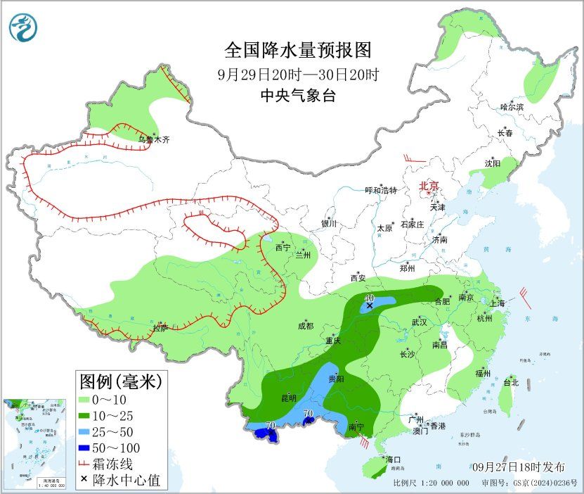 9月29日20时至30日20时,江汉中北部、黄淮西南部、江淮西北部、西南地区东部和南部、华南西部等地部分地区有中到大雨,其中,云南南部等地部分地区有暴雨(50~70毫米)。内蒙古中部、广西南部等地部分地区有4~5级风,东海北部海域、北部湾、南海中西部海域将有5~6级大风、阵风7级。