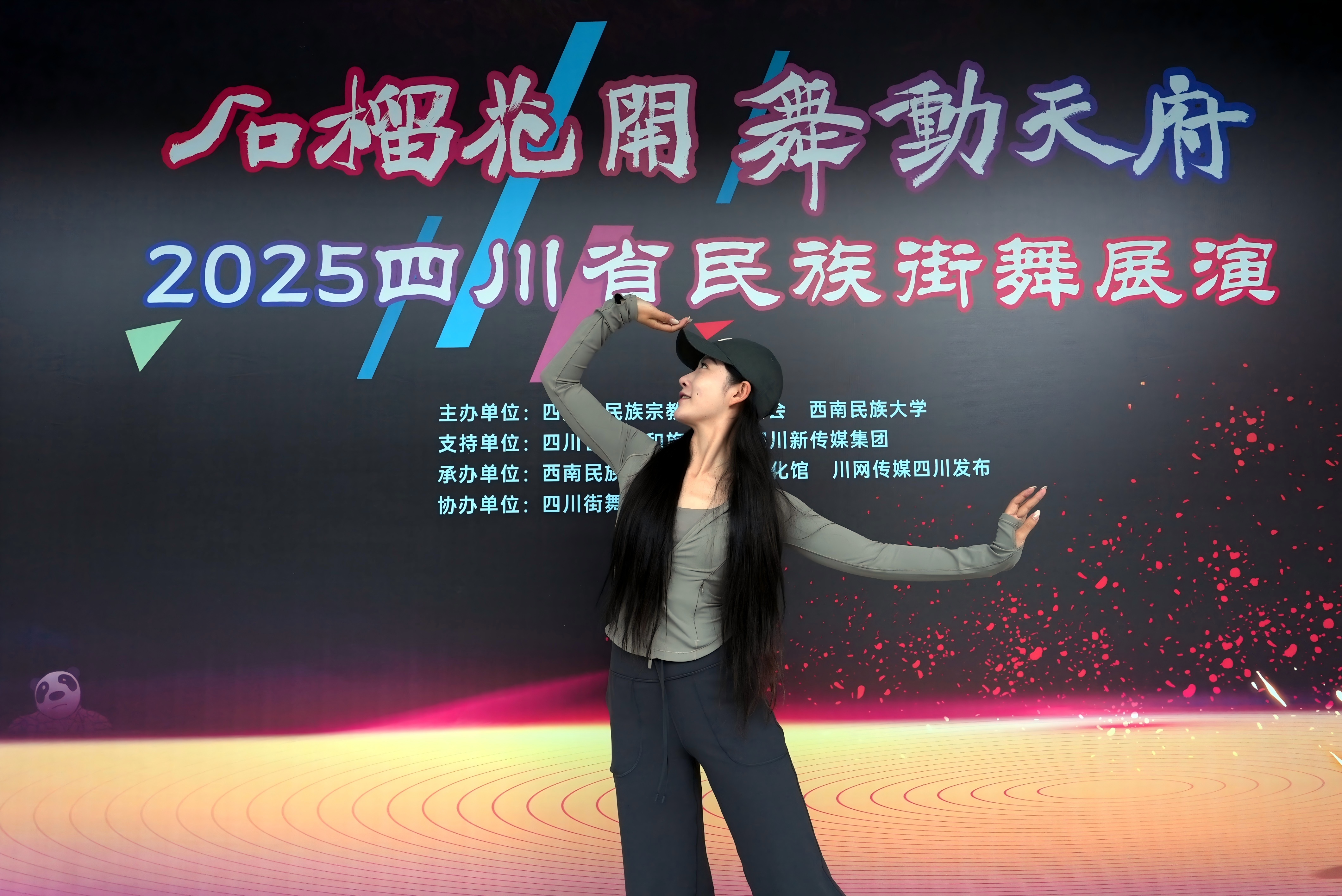 四川发布客户端消息 9月28日,在“石榴花开·舞动天府”2025四川省民族街舞展演现场,四川省街舞联盟编导万颖正准备此次的嘉宾秀。她此次带来的作品别出心裁,以新疆维吾尔族舞蹈为文化基底,融合街舞中的甩手舞(Waacking),试图在节奏与韵律间搭建一座沟通民族传统与都市潮流的艺术桥梁。