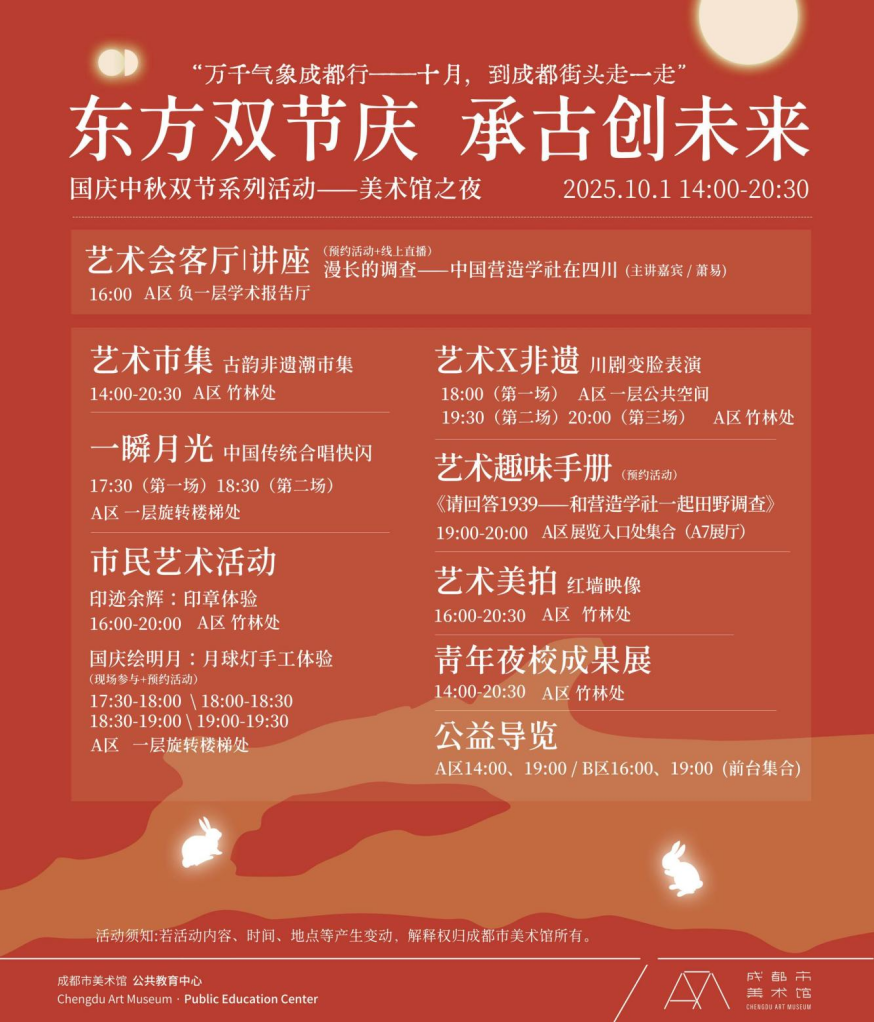 十一国庆节当天,成都市美术馆将举行“东方双节庆,承古创未来”主题美术馆之夜活动,游客观众们可以在现场观赏非遗表演、传统合唱等活动,还能亲身参与非遗技艺体验、艺术集市、游园印章收集等,收获趣味体验。