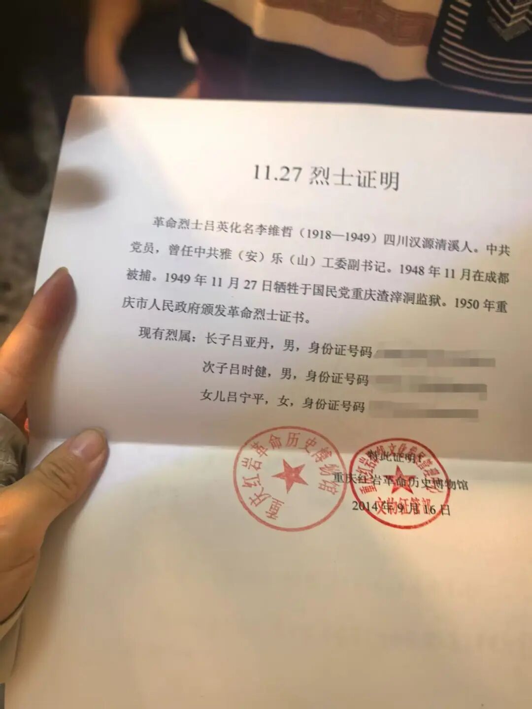 就在几乎放弃时,在重庆市退役军人事务局的协助下,他们得到一条疑似有用的信息,一位名叫李维哲的烈士家属信息高度吻合,可能是他们寻找的人。