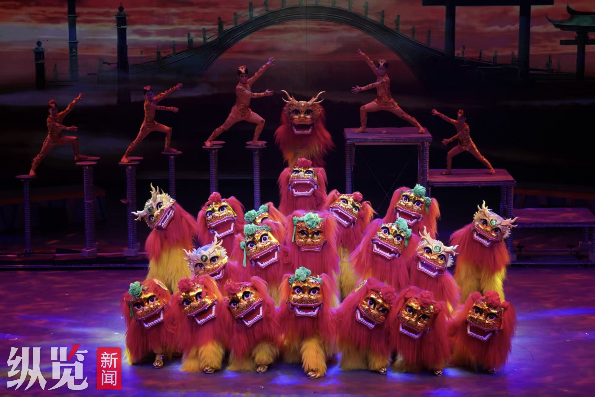 中国河北省杂技团演艺有限公司、沧州杂技团《祥狮跃九州》节目。张文进摄