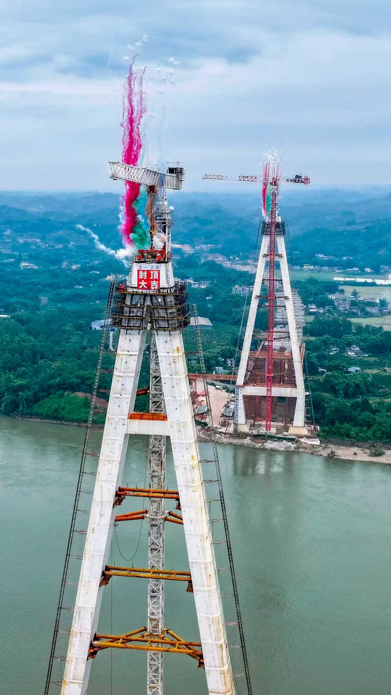 四川发布客户端消息 10月6日,由蜀道集团主导投建(川高公司主导投资、交通设计院公司牵头设计、四川路桥交建集团参建)的天府新区经眉山至乐山高速公路(以下简称“天眉乐高速”)控制性工程——虎渡溪岷江特大桥主塔顺利封顶,即将进入梁板安装工作阶段。虎渡溪岷江特大桥是四川省首座采用钢壳—混凝土组合索塔结构的大跨斜拉桥,此次主塔封顶标志着项目建设取得阶段性重大进展,为我国山区高速桥梁向工业化智能建造技术转型升级做出有力探索。