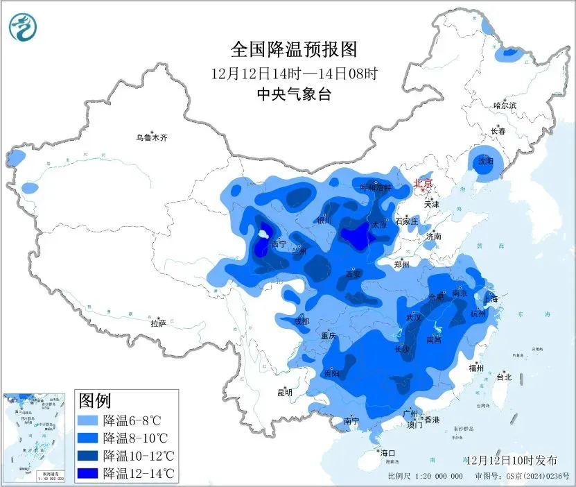 明天,寒潮迅速南下,影响将波及南方,长江以南多地气温将下降2至6℃,云南东部、贵州、江西局地降温或达10℃以上。13日至14日,最高气温10℃线将压至长江中下游一带,20℃线将退至华南沿海。南京、杭州、贵阳明后天最高气温只有8℃左右,与前期的偏暖反差感明显。