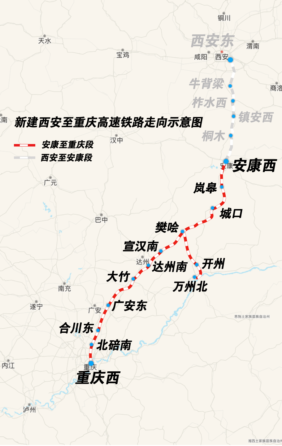 西渝高铁是我国“八纵八横”高铁网北京至昆明的京昆通道和包头、银川至海口的包(银)海通道的重要组成部分,路网地位十分重要。西渝高铁全长739公里,其中康渝段长478公里,设计时速350公里,自安康西站起,经陕西省安康市,重庆市城口县,四川省达州市、广安市,重庆市合川区、北碚区,引入重庆枢纽重庆西站。