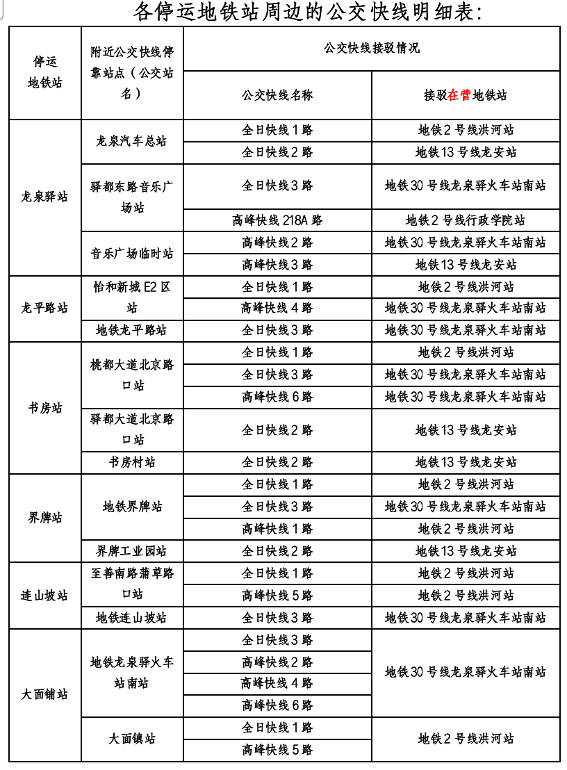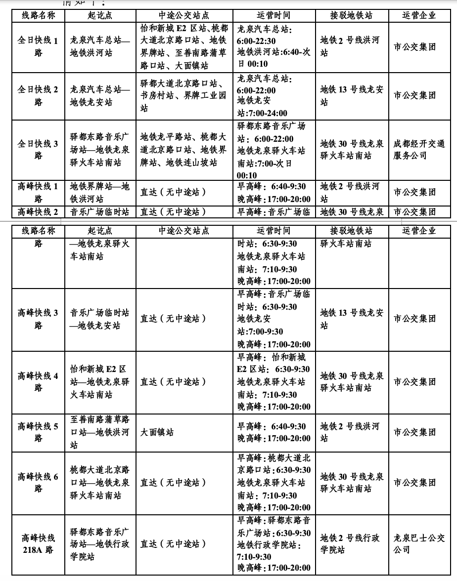 新开行的全日快线在平峰期及早晚高峰期均运行,保障市民基本出行,高峰快线在早晚高峰期运行,如遇大客流将加密发车班次,灵活采取滚动发车等方式服务市民。目前,每个停运地铁站周边区域均开行了多条公交快线接驳至运营地铁站,龙泉驿片区市民可选择就近乘车。成都公交后续将持续密切关注客流出行特征,结合实际需求动态调整线路发车频次、线路走向、停靠站点等。