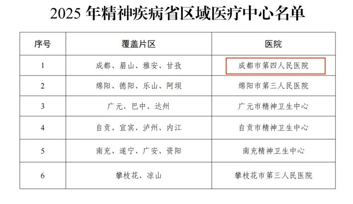 四川发布客户端消息 近日,四川省卫生健康委员会下发《关于印发2025年老年、眼科、精神疾病等专业省区域医疗中心名单的通知》,成都市第四人民医院获批四川省精神疾病区域医疗中心。