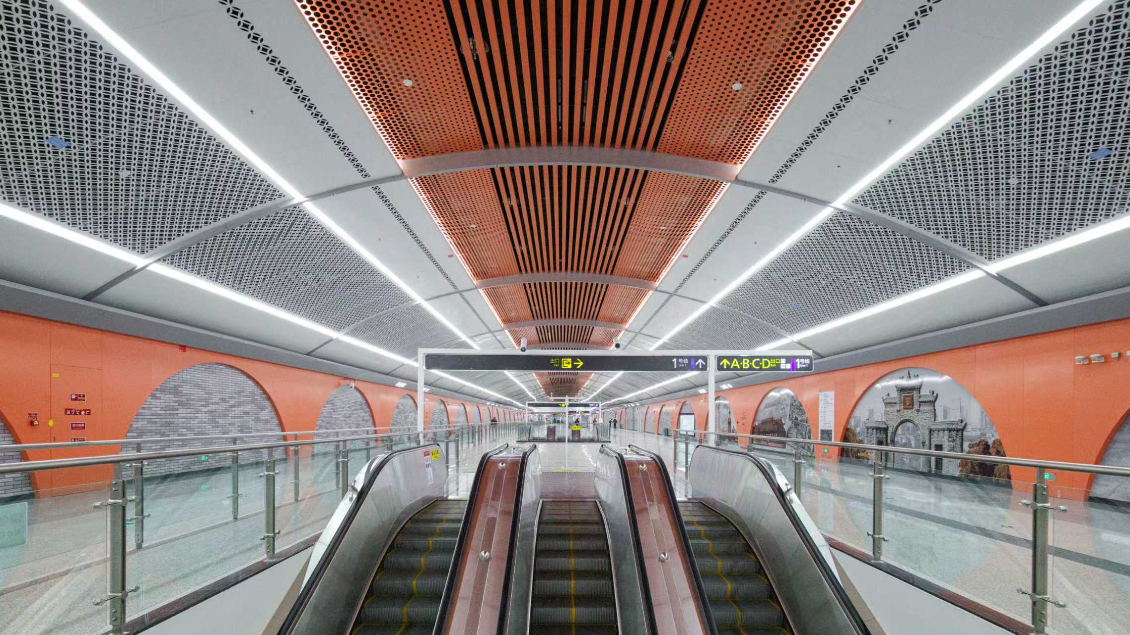 在满足交通功能的基础上,13号线一期全线以“诗意天府、人文成都”为设计主题,打造了光华村、杜甫草堂、青羊宫、文翁石室、华西坝、新南门、九眼桥、三官堂、幸福梅林站9座艺术车站,为市民构筑起一条便捷的“诗意通勤路”。其中,杜甫草堂、华西坝、幸福梅林站创新采用“无柱式”设计,打造出大跨度的无柱弧形拱顶,在确保结构安全的同时,营造出站厅空间开阔通透的视觉震撼。