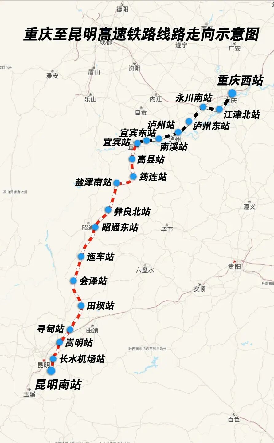 渝昆高铁是我国“八纵八横”高铁网京昆通道的重要组成部分,线路起自重庆西站,途经重庆市、四川省、贵州省和云南省,接入昆明南站,全长约700公里,设计时速350公里。全线分段建设,其中,重庆西至宜宾段已于2024年9月29日贯通运营,宜宾至昆明南段正在加紧建设中。