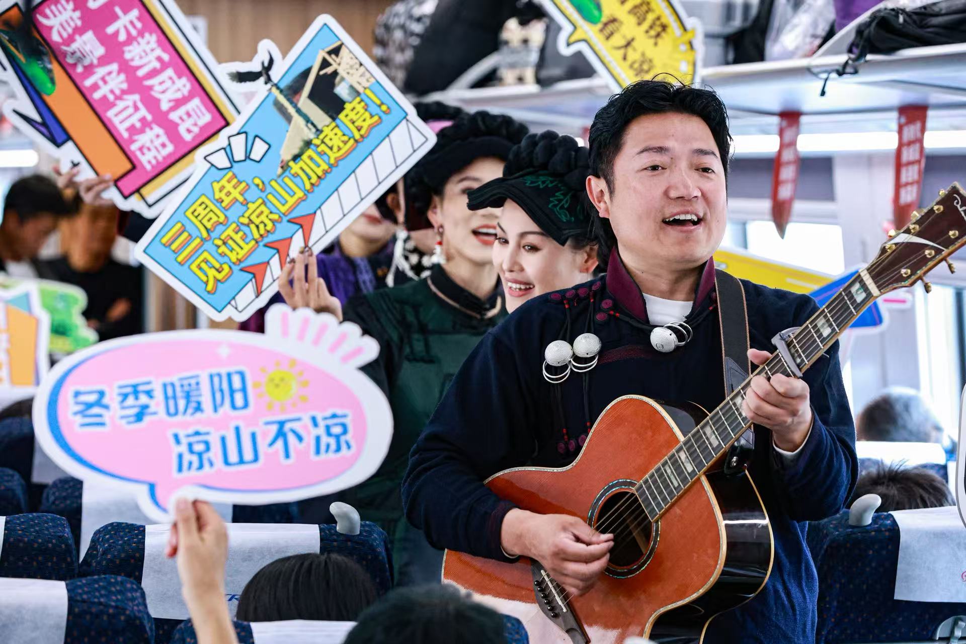 四川发布客户端消息 12月26日15时17分,西昌西站凉山五彩云霞歌舞团的演员们身着彝族服饰载歌载舞,迎接新成昆铁路开通运营三周年。
