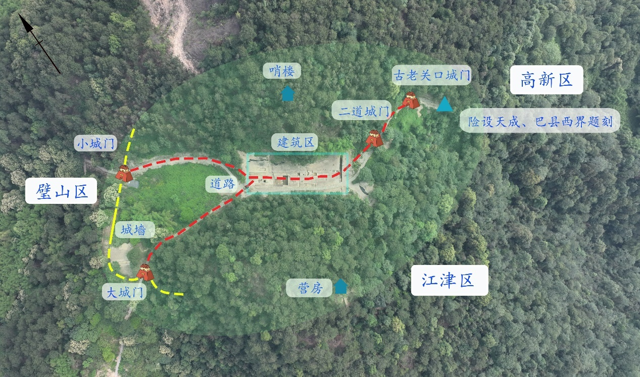 老关口遗址是集城防、道路及生活设施为一体的关隘遗址,是明清时期成渝古道东大路沟通缙云山脉东西两侧白市驿和来凤驿重要节点,对于研究成渝之间的商贸往来、人群迁徙、文化互动等具有重要意义。