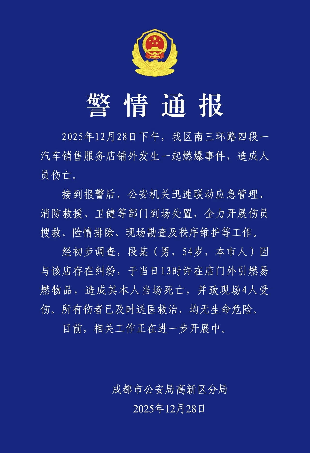 成都警方通报:一汽车销售服务店铺外发生燃爆事件,造成1死4伤