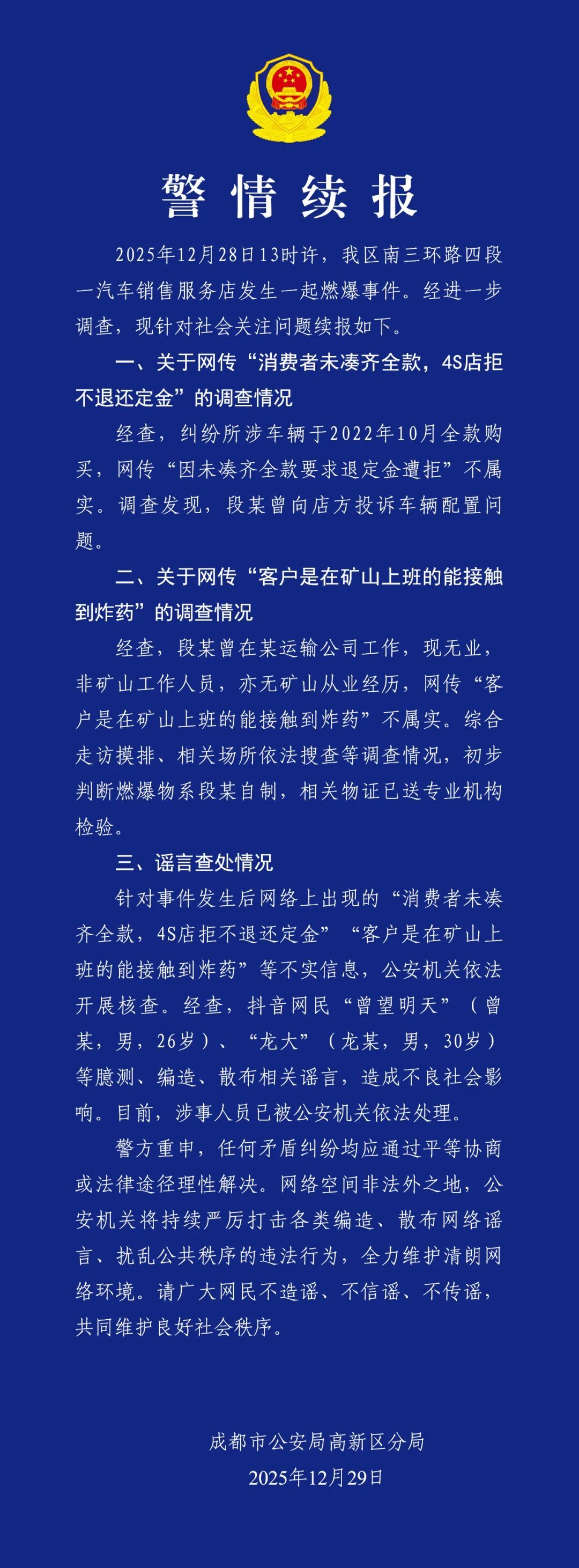 2025年12月29日,成都市公安局高新区分局发布警情续报: