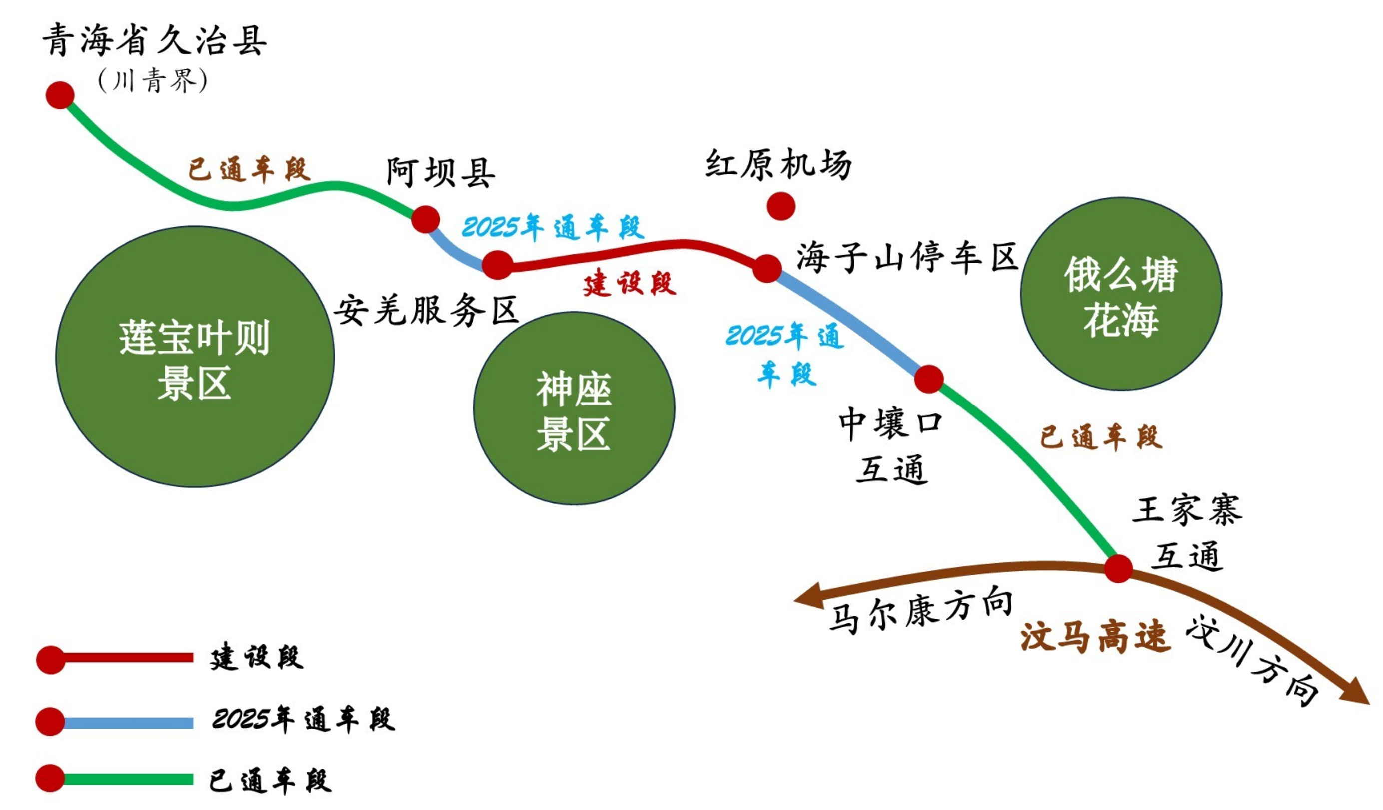 截至目前,久马高速已建成通车川青省界至阿坝收费站50公里、中壤口互通至王家寨互通48.5公里,以及通车段87.5公里,累计通车里程达186公里,剩余33公里力争2027年建成。项目全线建成后,成都至青海久治的通行时间将由8.5小时缩短至5.5小时,对强化区域经贸文化交流、推进“大九寨”交旅融合、助力乡村振兴具有里程碑意义。