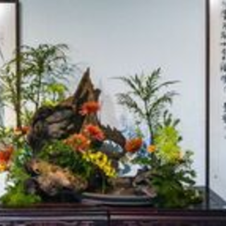 其中,特大型中国传统插花 《山河万里家国情》和《二梅迎春贺盛世》两件作品,堪称本届中国式插花艺术展的扛鼎之作。两件作品陈列于杜甫草堂兰园两棵千年古银树下,分列川派盆景大师李忠玉特大型山水盆景代表作《西蜀秀色》两侧,巧以梅花、蜡梅等传统报春花材,搭配罗汉松、马尾松、毛竹等巴蜀特色植物,以花艺勾勒春和景明之象。