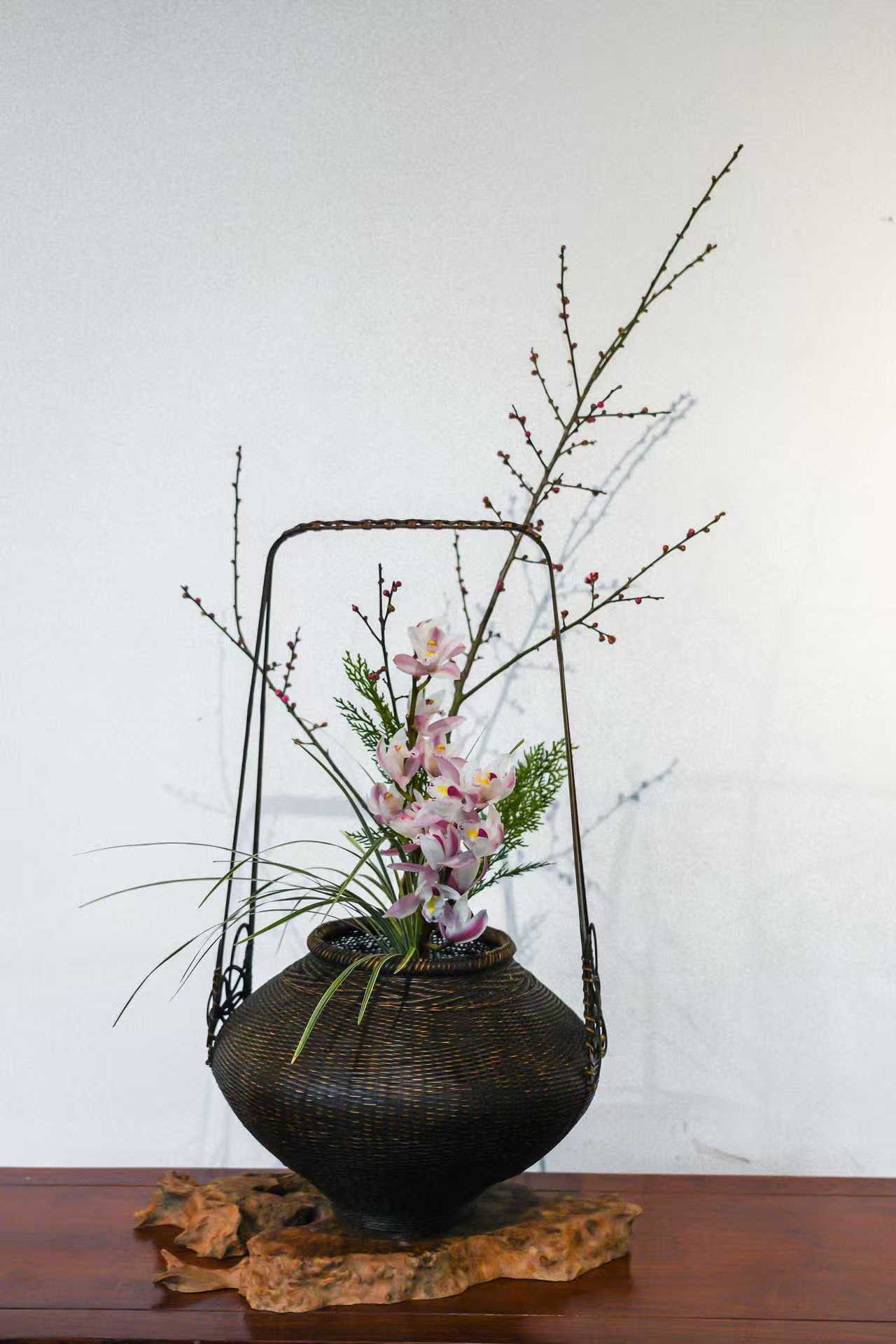 展览以“诗花相和 梅香草堂”为主题,展出了来自成都幸福梅林的《谁敢斗香来》、《古梅遗韵》和《若为看去乱乡愁》等古桩蜡梅盆景精品。创作者们巧用松、竹、梅、菊、兰等传统花材,搭配枯木、苔石、古器等元素。其中既有遵循传统技法的经典之作,展现中国式插花的程式之美;也有跨界融合的创新作品,将空间美学、数字技术与传统花艺相结合。