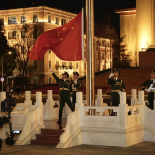 6时59分,擎旗手和升旗手齐步走上升旗台基座,护旗队员面向国旗分区站立。