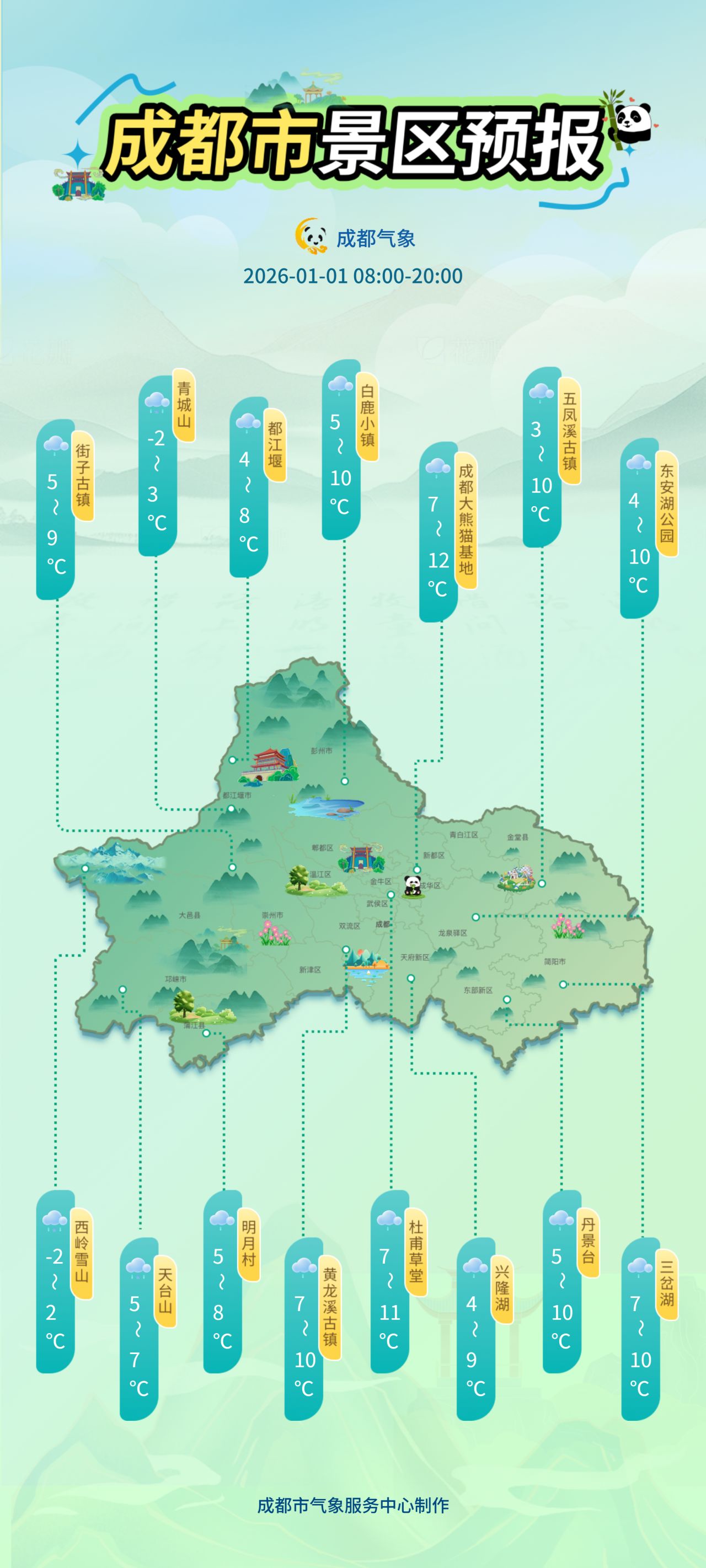元旦假期,成都各个景区天气情况如何?记者注意到,成都市气象台还发布了景区预报信息,包括青城山、都江堰、西岭雪山、成都大熊猫基地、杜甫草堂等,供市民游客出行参考。