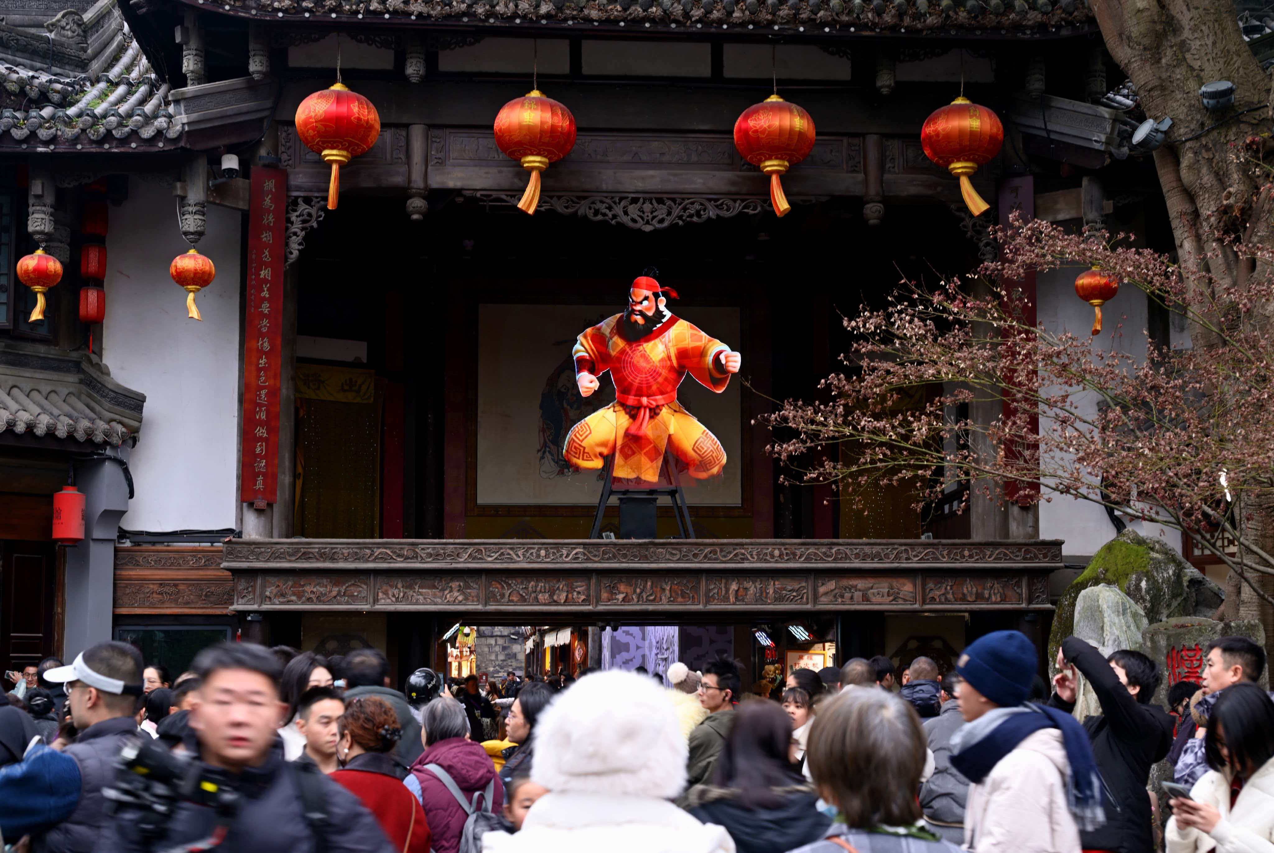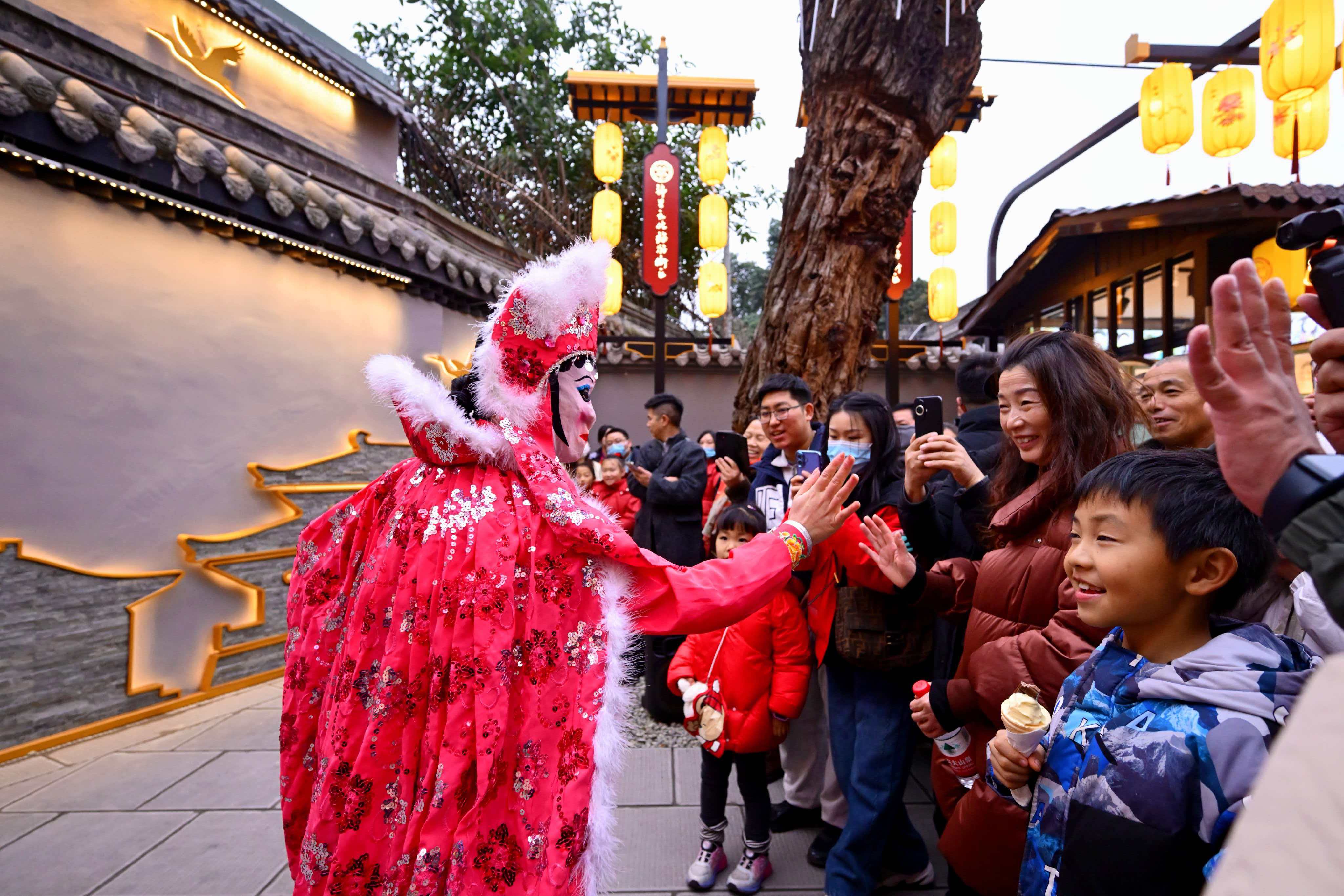 “非遗贺岁”表演同样大放华彩。木偶戏《锦里羽绸》巧手赋魂,展现非遗灵动;双人杂技《力量》与球技《九霄抛星》彰显力与美的默契;融入蜀锦元素的《蜀锦红颜》及神奇莫测的川剧变脸,令人拍案叫绝。在锦里'