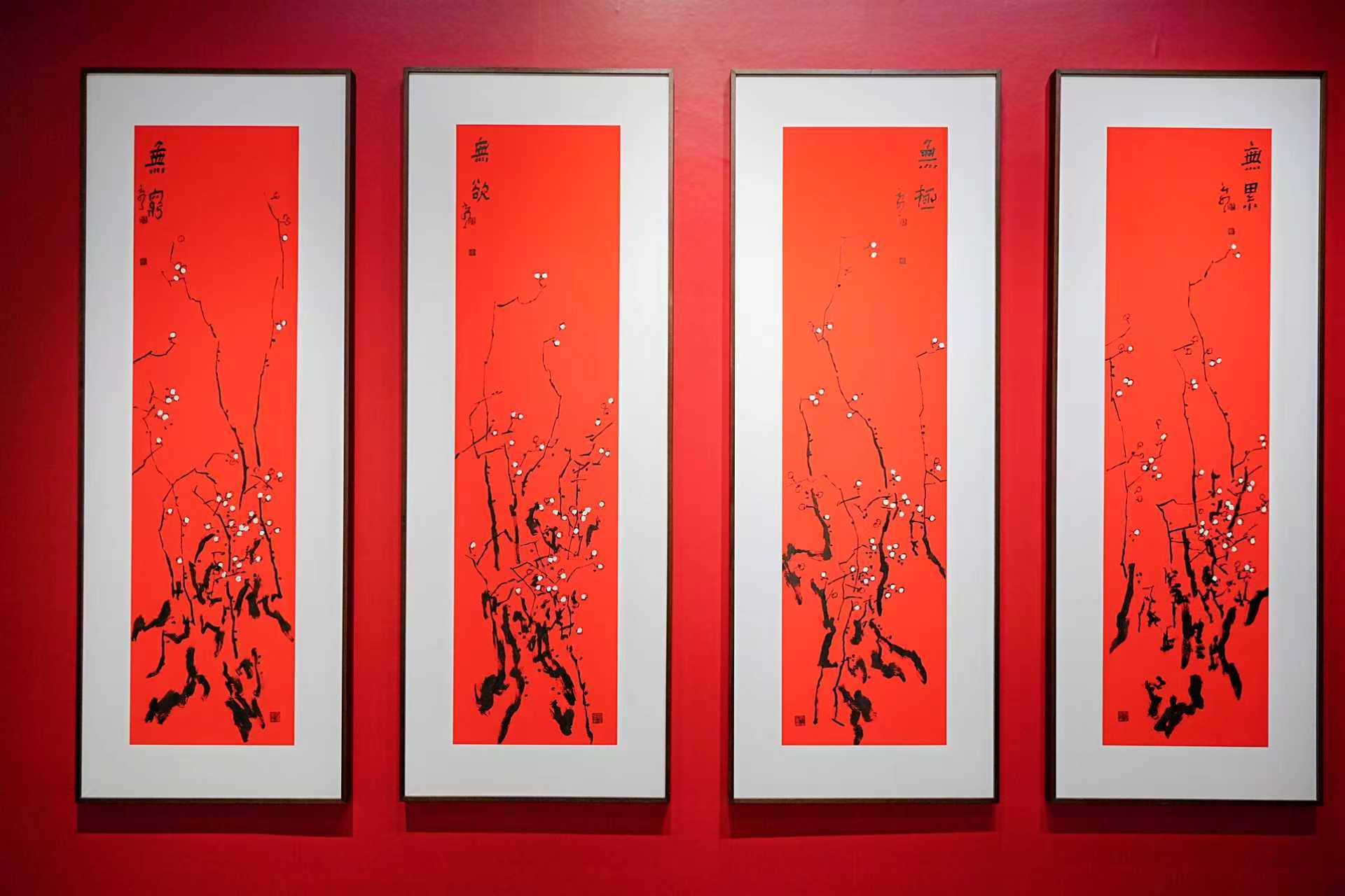此次“诗言花语──刘云泉写梅展”汇聚了刘云泉近年来的写意梅花和书法作品共66件,梅花以水墨设色为主,融诗、书、画于一体,展现其对梅花题材的长期体悟与当代表达。