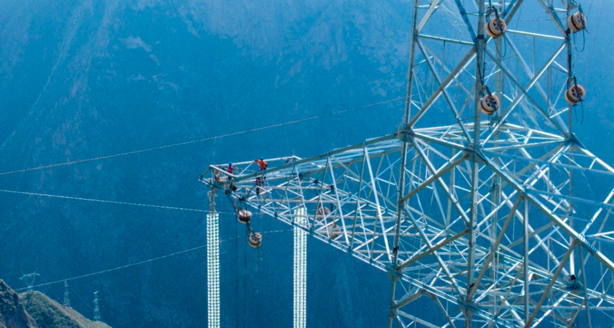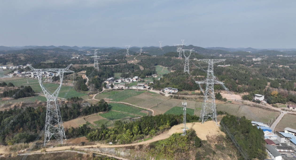 现场,一座座崭新的铁塔巍然耸立。电力工人们系着双保险安全绳,站在铁塔上,在寒风中进行附件安装作业。他们脚下,一条条银色导线在设备牵引下缓缓升起,横跨河谷、翻越山脊,将铁塔相连,勾勒出绿色清洁的能源动脉。