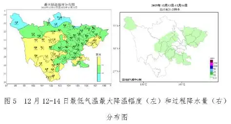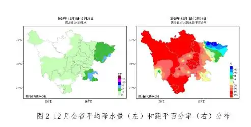 与此同时,全省平均降水量偏少42%,位列历史同期第10少位。12月全省平均降水量5.7毫米,较常年同期偏少42%,位列历史同期第10少位。盆南和盆东北10.0~30.0毫米,兴文站全省最多(38.0毫米);攀西地区北部和东南部降水量0.1~2.0毫米,其余大部无降水;川西高原南部和东部降水量0.1~1.0毫米,其余大部无降水。与常年同期相比,全省除盆东北和川西高原西南部偏多外,其余大部偏少1~9成。全省有39县站无降水,主要分布在攀西地区和川西高原。