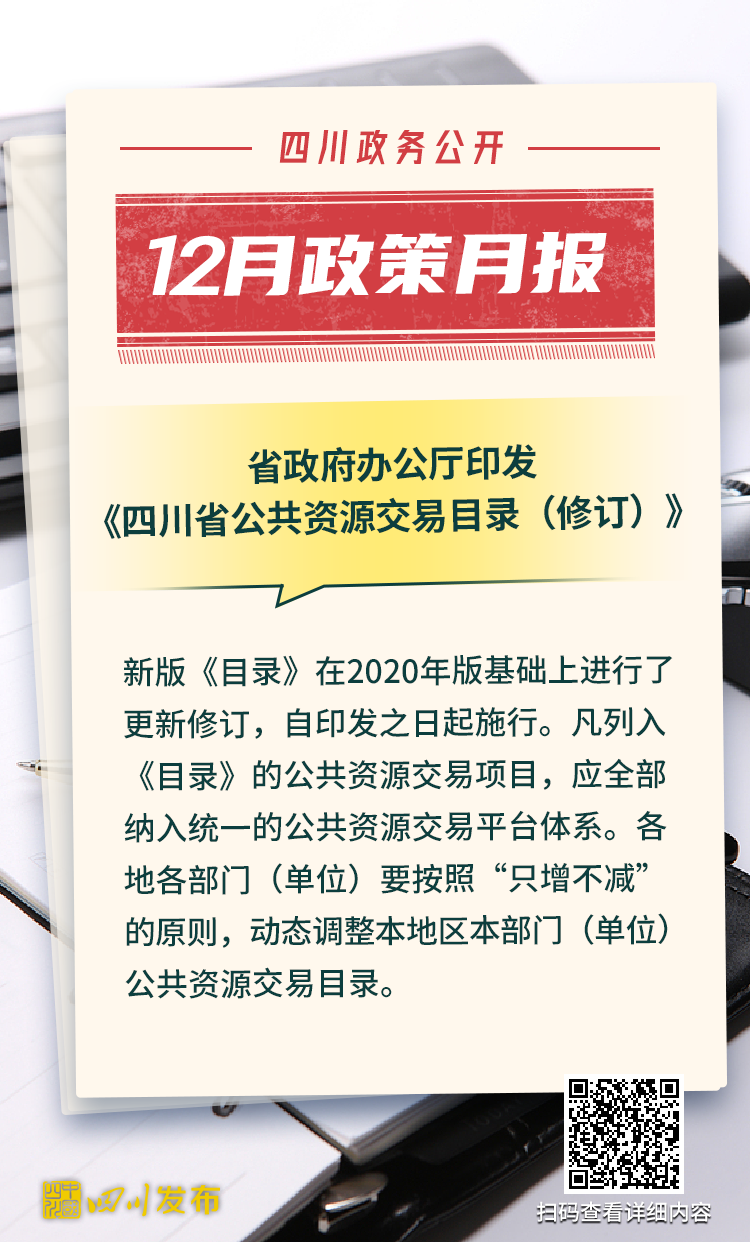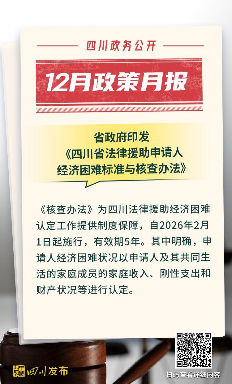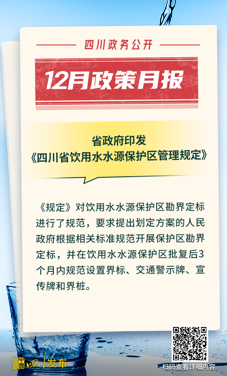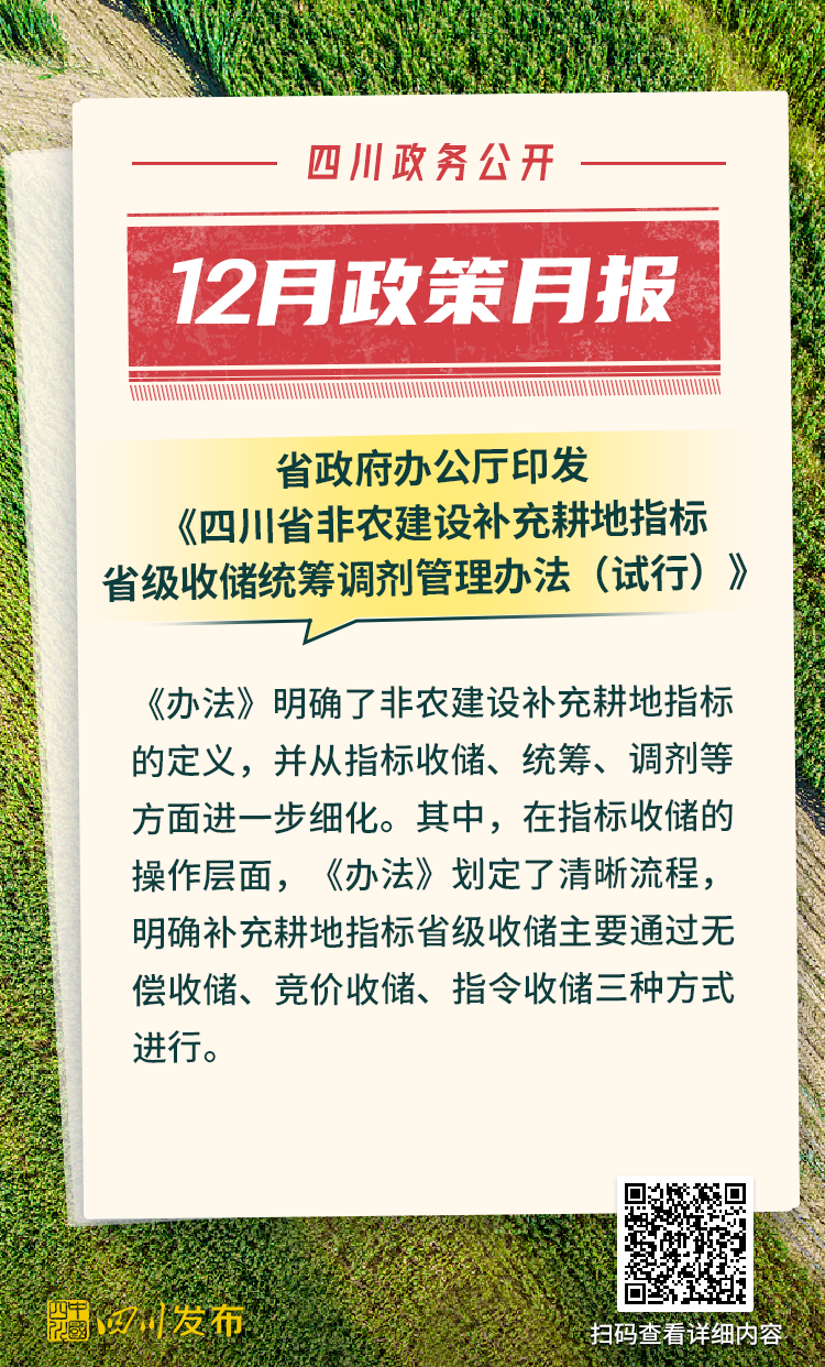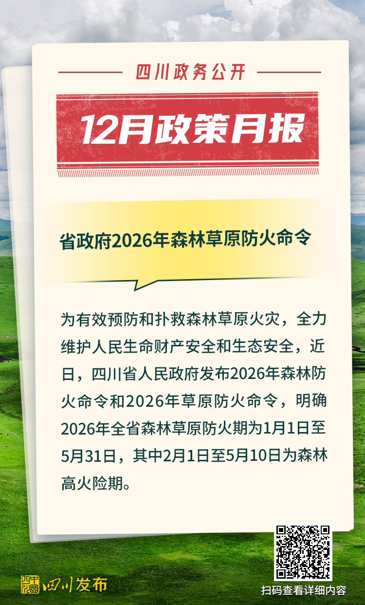 四川省人民政府2025年12月出台了多项重要政策。其中,涉及12345政务服务便民热线、电网建设项目行政审批、生物医药和医疗器械产业、非农建设补充耕地指标省级收储统筹调剂、突发事件应急预案、森林草原防火命令、法律援助、公共资源交易目录、困境儿童福利、人工智能赋能新型工业化、农村公路提升行动、惠企政策全生命周期管理、饮用水水源保护区、政府购买公共文化服务、成品油流通、研发投入等重要方面。
